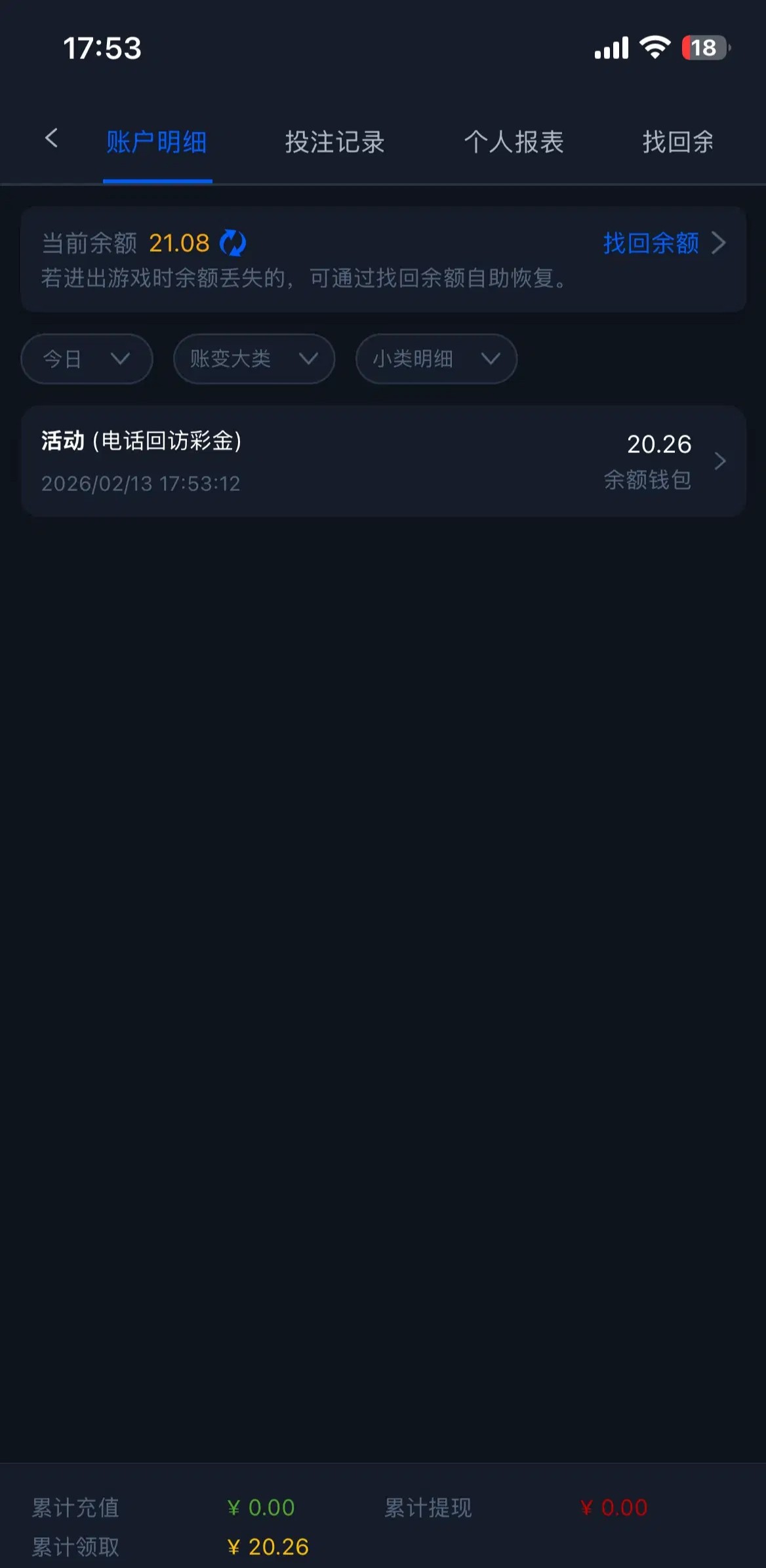 一年比一年缩水活动搞得像狗屎一样,回馈的平台很少,基本就统计几个月或者一年内打码和充值,大部分都是充值活动,想白嫖很难了,历史注册保底都没有的,时代变了,不念旧情,只讲现实!很难走下去,不活跃的回馈也是卡款,一毛不拔,狗庄养不起了现在,无底洞,深不可测