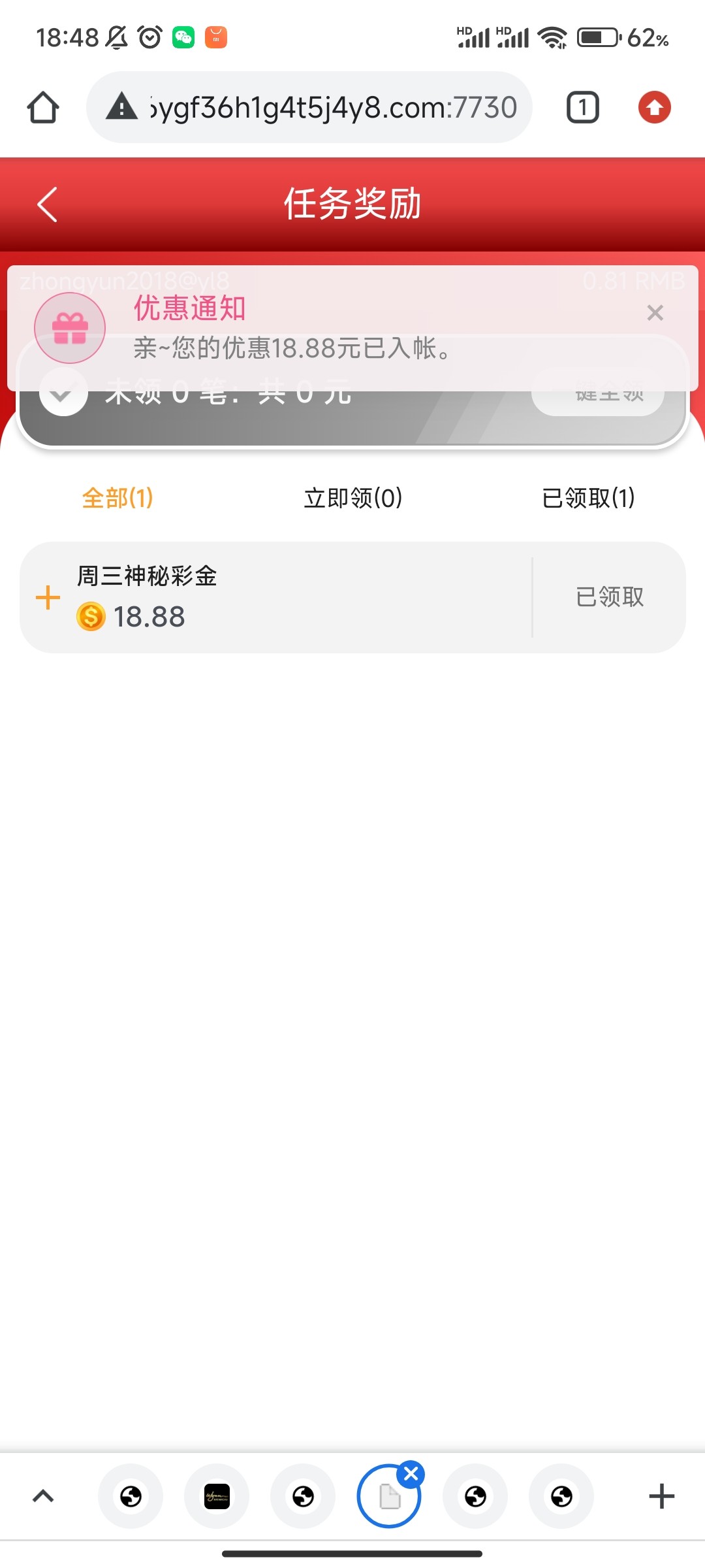 玩过的每个礼拜星期3给18.88,一般下午6点给。我半年多没打出来了,之前打出来过。三个月之内玩过的打出来直接提,三个月之后打出来存10,灵活点提,听说这个台子黑大额,我是去年玩的几千没黑我