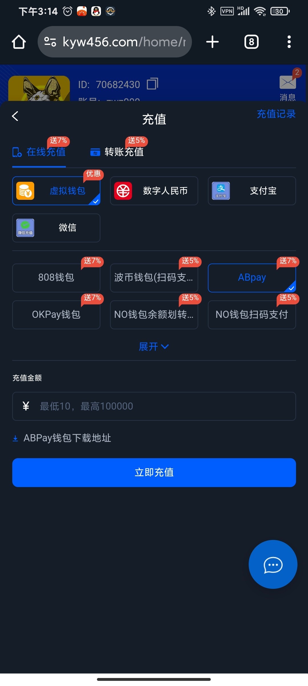 ②注册abpay账号:点充值,金额随便选abpay充值,跳转abpay(跟钱能一样属于内置,不能直接注册通过充值入口会自动创建)填写姓名和交易密码后在主页设置ab号(既钱包账号)然后实名