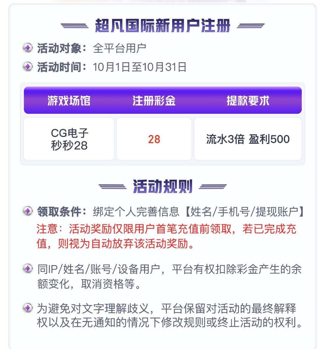 本站声明 1、本帖标题:【超凡国际】— 注册送28