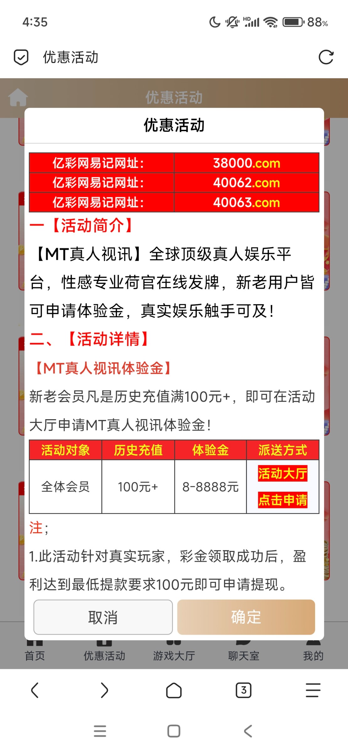 历史充值过一百的可以申请MT真人体验金,IP地址不黑的可以申请新人体验金,喜欢玩彩票的可以玩一百包赔