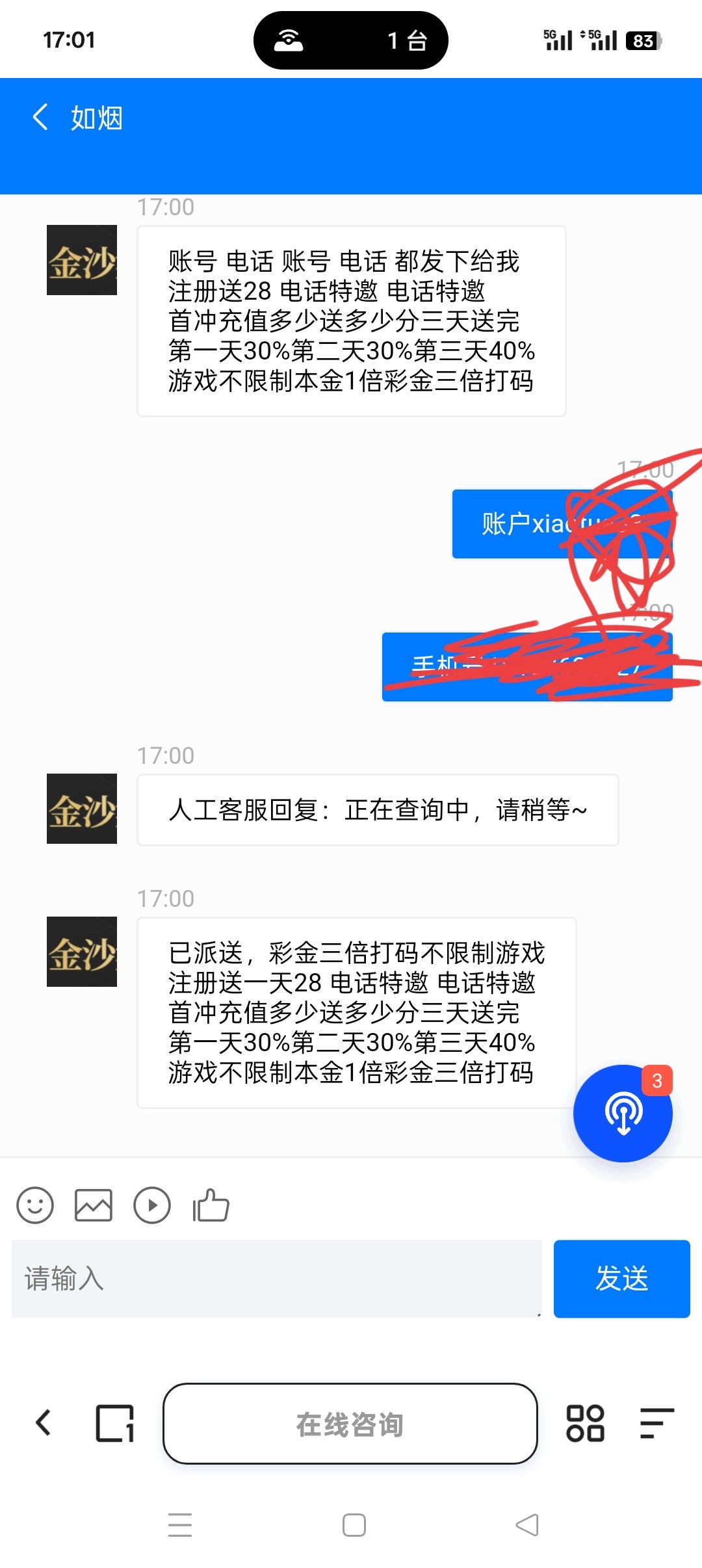 我是接电话送的 漏接的可以去碰一碰。