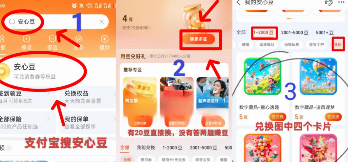 支付宝搜索“安心豆”按图中步骤领取四个卡片,每天可领4个,最多领20个卡片,可以领5天。变现可以去闲鱼卖价格合适就出反正几包烟水钱是有的