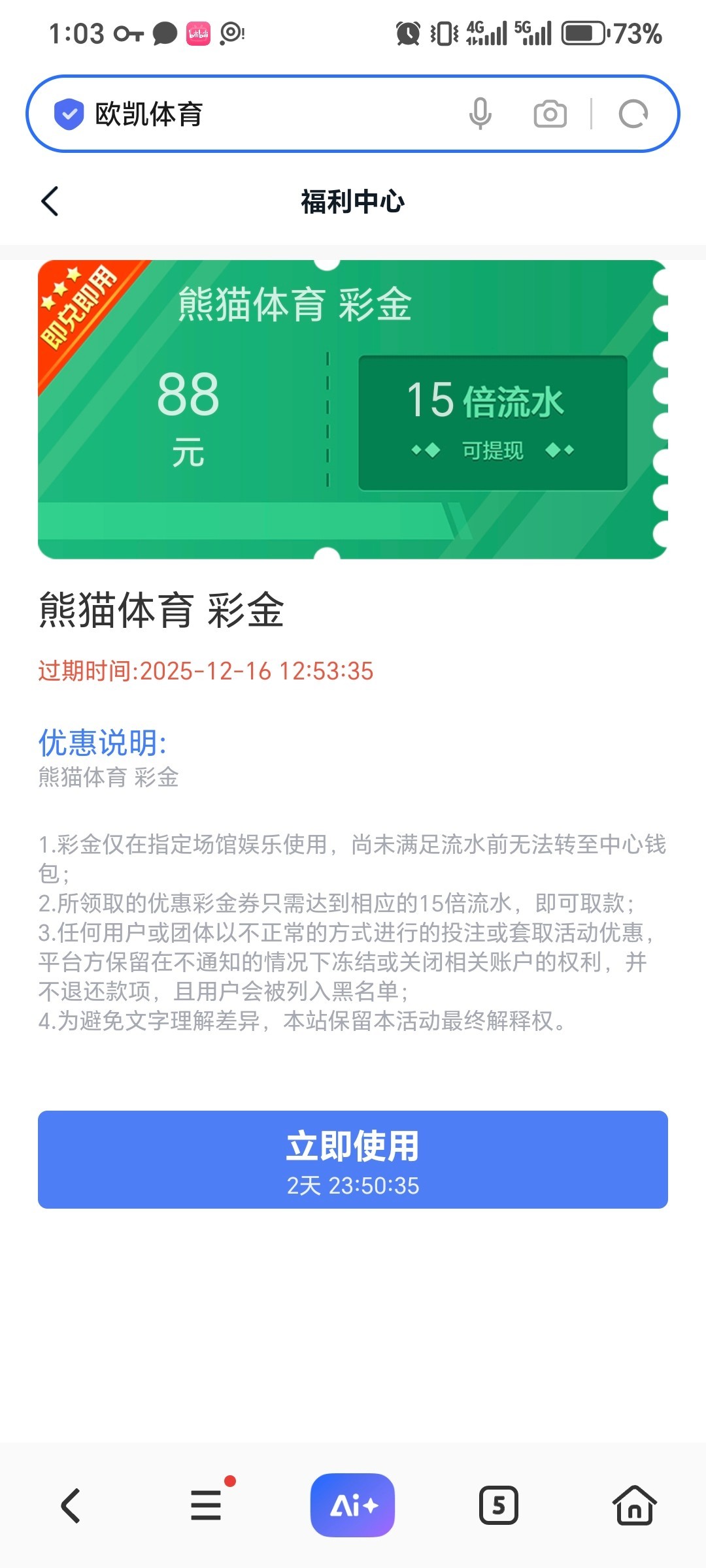 注册送88 注册找客服说领取特邀彩金,88只能打熊猫体育15倍流水,我出了500,开始还以为是黑台,结果提现秒到,应该不需要特邀,我朋友没收到短信注册也送了,必须走短信里面的链接注册才送