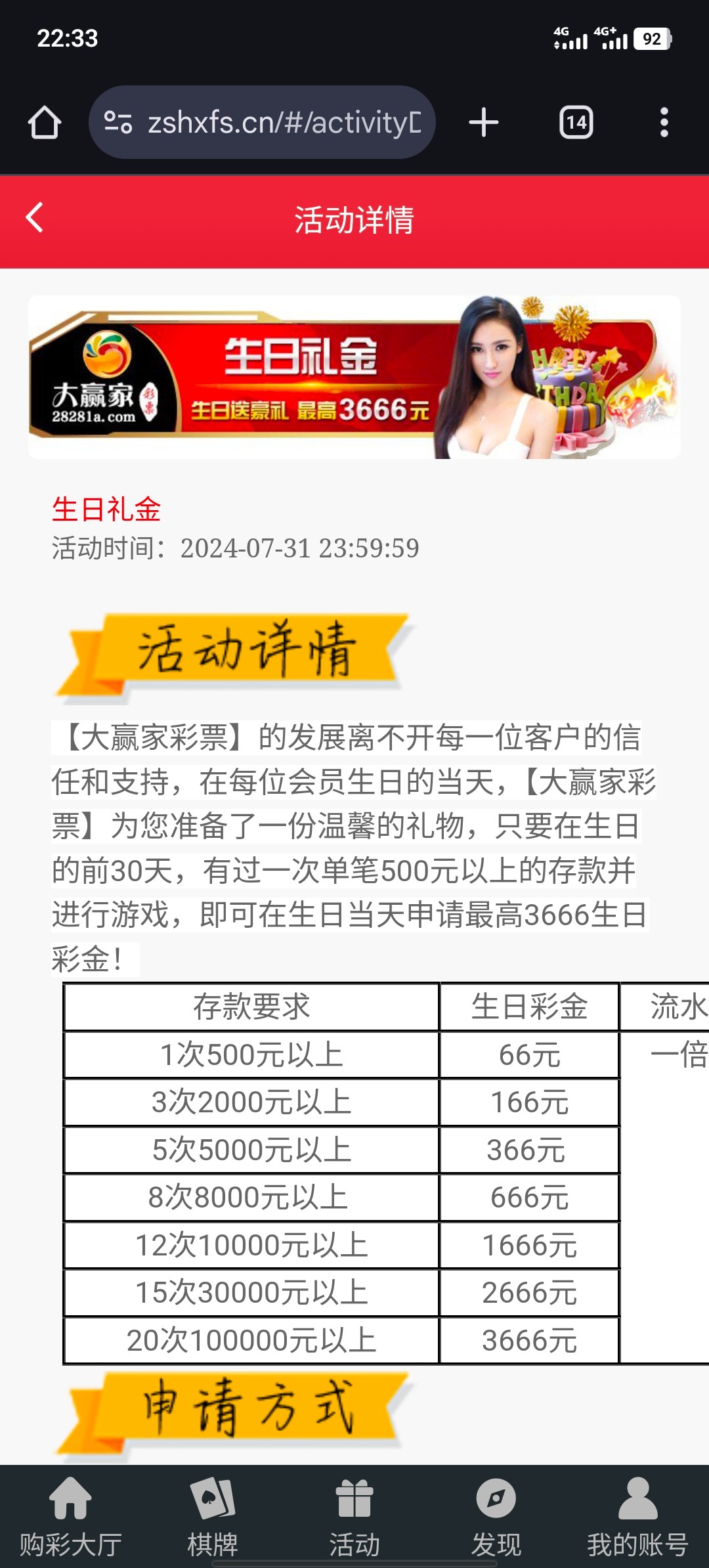 只要在生日的前30天,有过一次单笔500元以上的存款并进行游戏 即可在生日当天申请