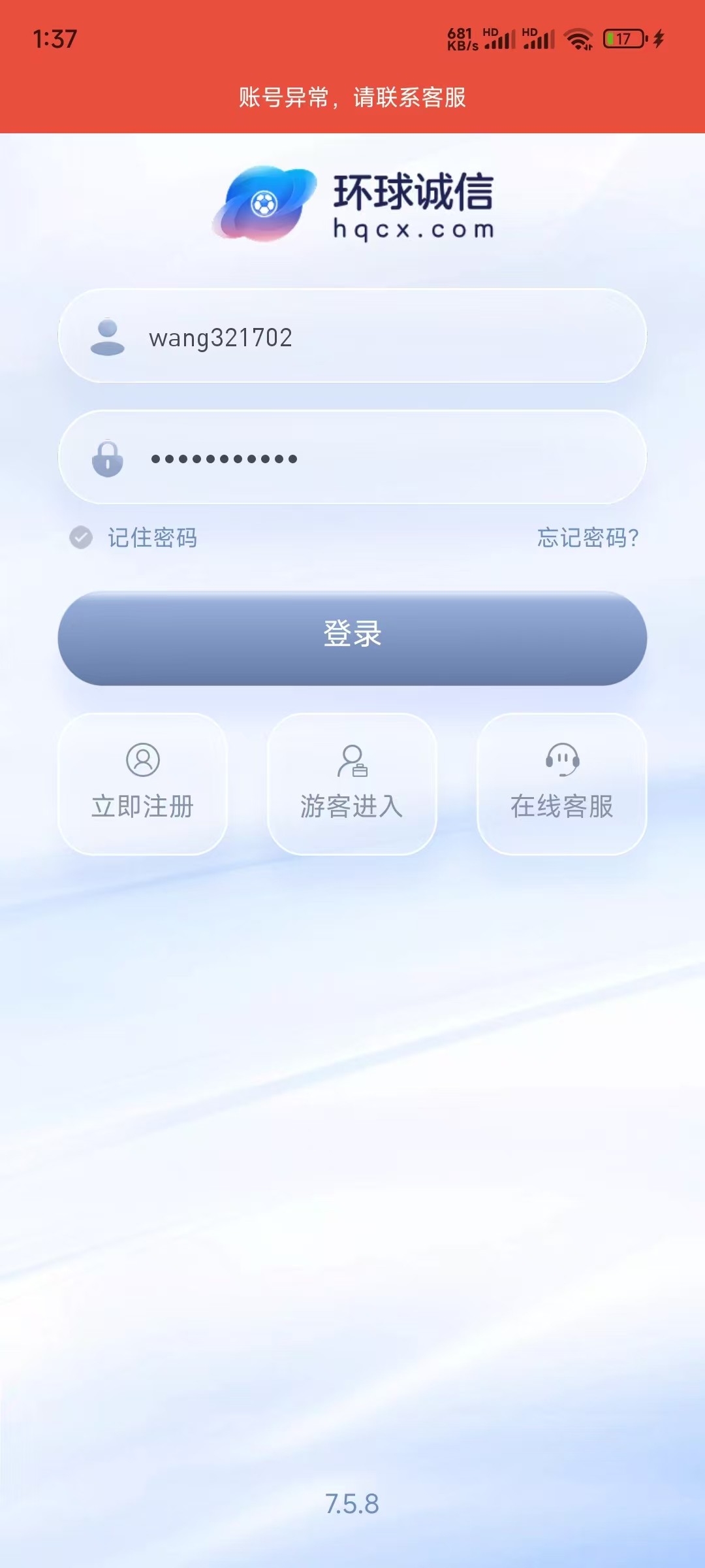 今天收到手机短信,说是EB开新台,老用户送688,捧着免费白菜的心态回复了,然后让我下载一个球聊的软件加专员,加了专员后让我在hqcx.com上面注册新号,说是免费送688,VIP0送88,打到VIP1送100,VIP2送200,VIP3送300,总共送688,中间一直给我推送充多少送多少的活动,其中迫切的问我什么时候开始充值,我说先试玩下,送了88,要求5倍水,我按照要求打了450的水,88打到219,申请提款,然后就是一直审核,等了半个小时,先是球聊的软件说我是刷子,把我账户永久封禁,接下来就是环球诚信的网站也登录不上了,账户异常,劝大家这几天收到此类短信千万不可信,充值了就是送狗了