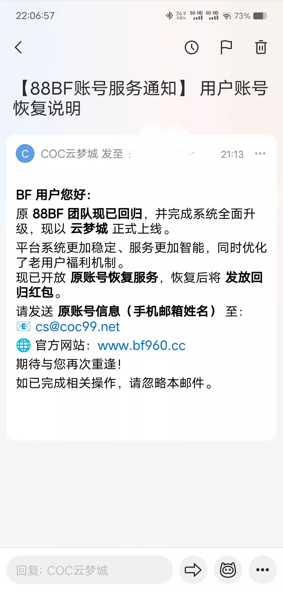 88bf/云梦城有号的发邮件碰瓷回归彩金,没有收到这个邮件的也可以试试,给了58。请发送 原账号信息(手机邮箱姓名)至:cs@coc99.net