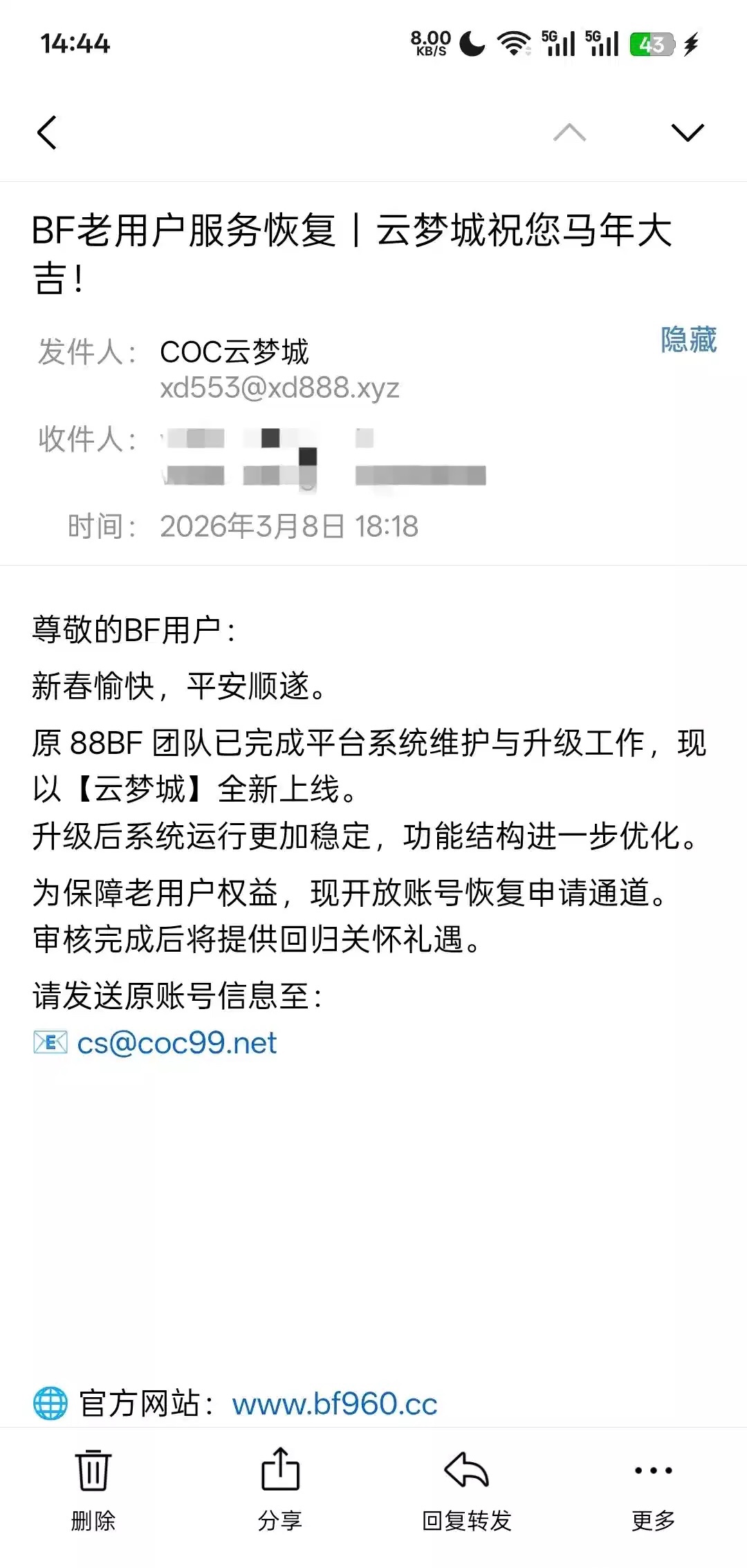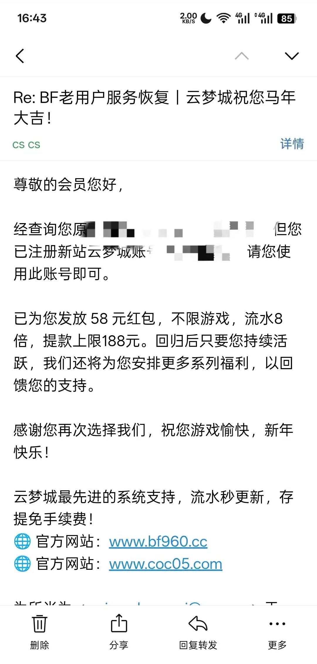 收到个邮件,云梦城发的,说什么必发88老会员,回复了下送了58(没充过值)